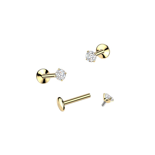 ✨ 24K Gold PVD Titanium Internally Threaded Convex Back Labret With Prong Set CZ Top