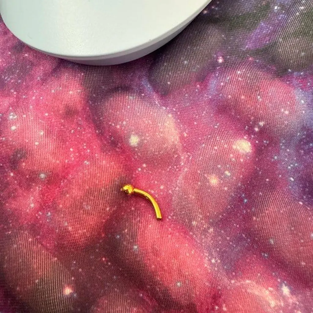 Luxurious gold titanium threadless curved barbell with one fixed ball end. Permanent gold PVD coating won't fade or tarnish. Perfect for eyebrow and navel piercings. Threadless end allows custom top changes. Implant-grade titanium is hypoallergenic and safe for sensitive skin.