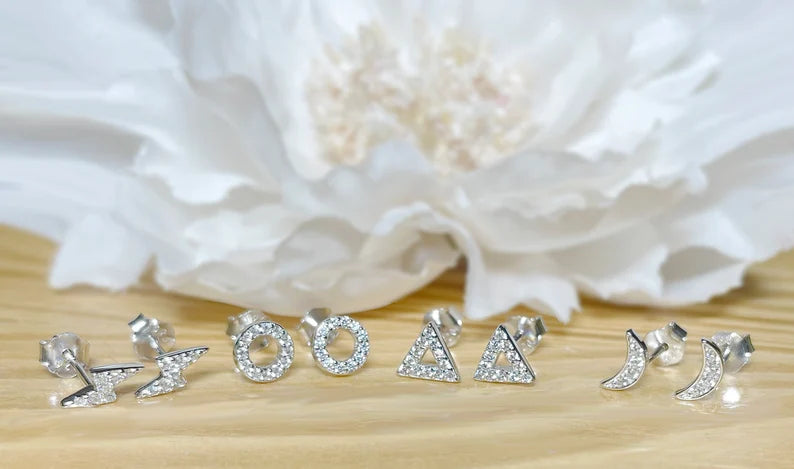 ✨ 925 Silver CZ Stud Earrings Circle/Triangle/Lightning/Crescent