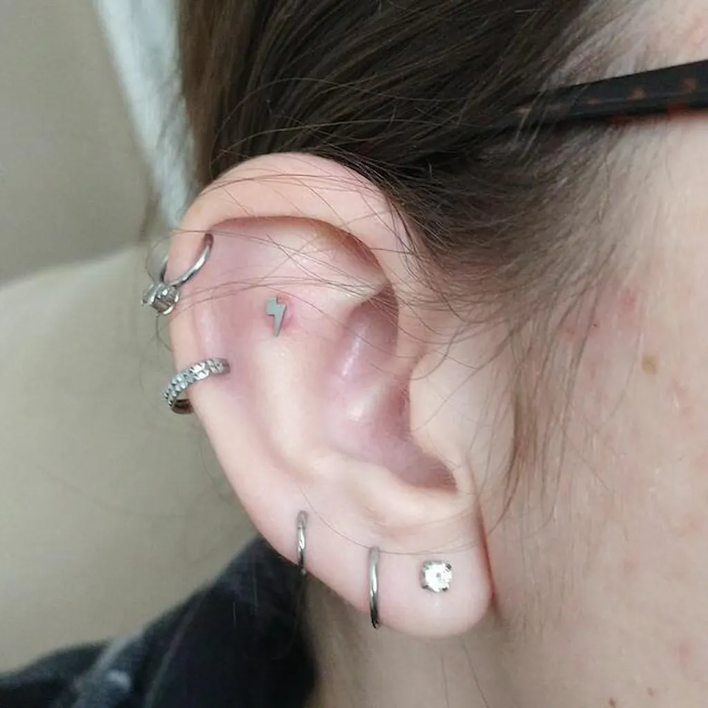 Love this lil lightning bolt! I bought a separate post from the same seller than was a bit shorter (5mm) and used it for my flat piercing. It looks and feels great! I was struggling with this piercing because the gem jewelry I was using was causing the surrounding area to be pressed into awkwardly. With this flat jewelery, it already feels better! Very tiny and kind of hard to line up and screw in, but it works great!